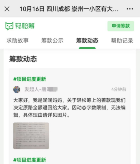 10月25日,@轻松筹 微博发布退款说明表示,10月23日,受伤女童转出ICU,情况比较稳定,经与发起人沟通,轻松筹将对未使用的所有善款全额原路退回。